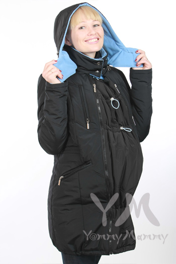 в комплект к куртке включены два капюшона: один для мамы, другой для ребенка. Оба капюшона отстегиваются, имеют кулиску по окружности для регулировки размера и плотности прилегания, а также застегивающийся воротник для защиты шеи.