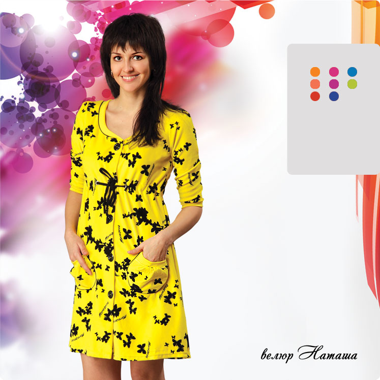 Модель: молодежный халат приталенного силуэта на пуговицах. Особенности данной модели – круглые накладные карманы и рукав ?. Силуэт формируется за счет кулиски под грудью. Линии горловины и карманов подчеркнуты кантом в цвет набивного рисунка. Благодаря своей яркости и динамичности, халат «Наташа» выпускается под торговой маркой «Fresh».