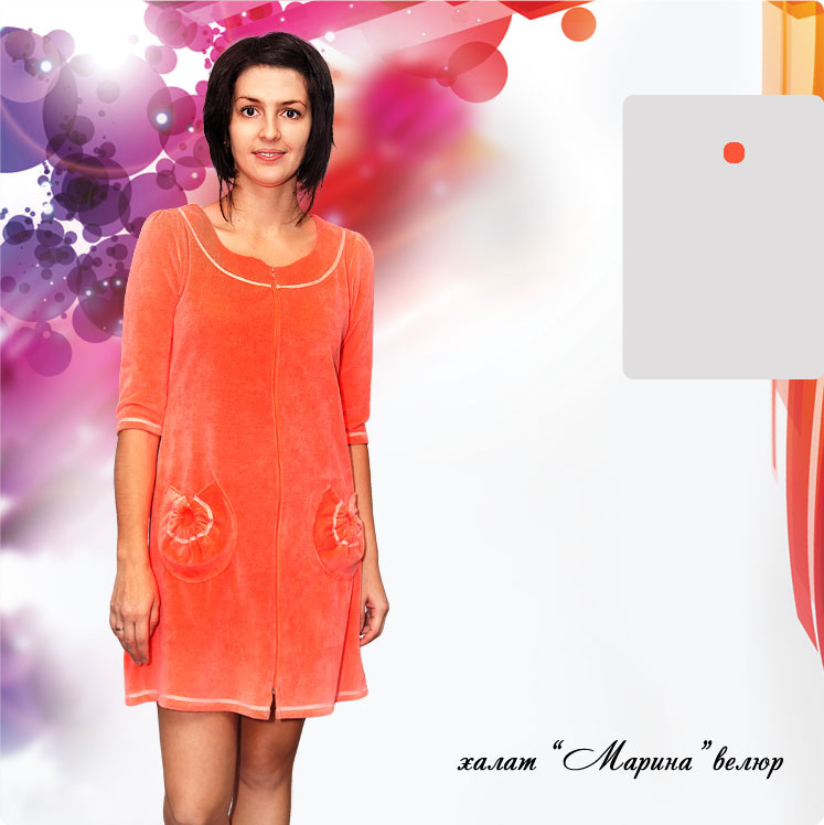 Модель: молодежный халат прямого силуэта на молнии, регулируемый сзади на пояс. Модель интересна круглыми карманами собранными на кольцо, круглым вырезом горловины, рукавом ¾. Халат подчеркнут декоративной строчкой по линии горловины, низу рукава и низу изделия.