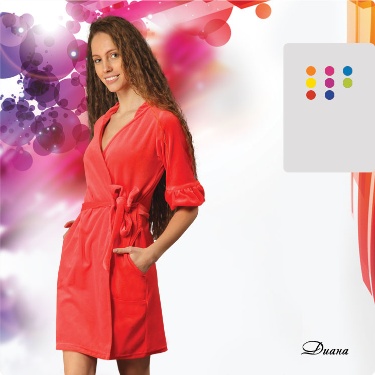 Модель: молодежный халат приталенного силуэта на запах с боковыми карманами. Особенности данной модели – рукава ?, с драпированными манжетами, воротник-стойка. Выпускается под торговой маркой «Fresh».