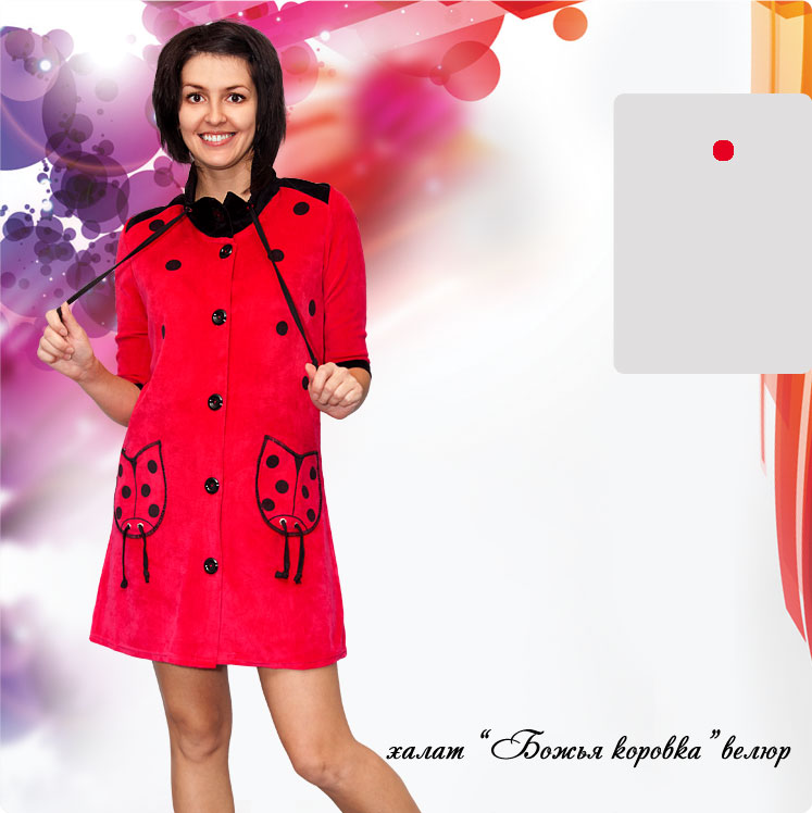 Модель: молодежный халат приталенного силуэта на пуговицах, с круглыми накладными карманами и с рукавом ¾. Особенности модели: карманы с печатью в форме "божьей коровки", низ рукова, воротник-стойка и плечевая вставка на полочках выполнены в черном цвете, воротник-стойка собирается по краю на шнурок
