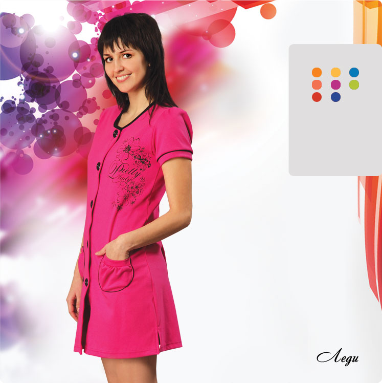 Модель: Молодежный халат прямого силуэта на пуговицах. Модель интересна удобными накладными карманами, круглой горловиной и коротким рукавом. Линии кармана и манжета подчеркнуты кантом в цвет отделки. Халат «Леди» выпускается под торговой маркой «Fresh» и внесет яркость, легкость и комфорт в Вашу жизнь.