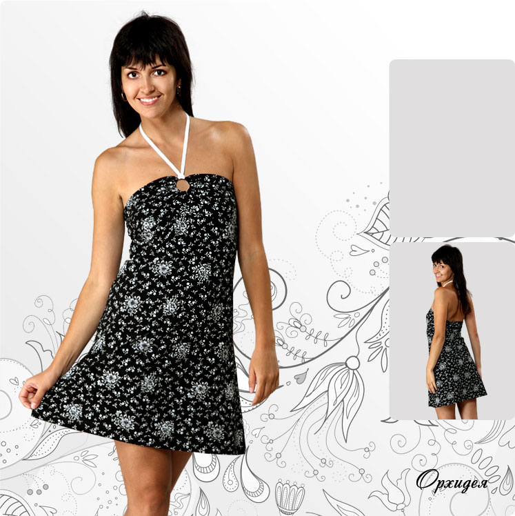 Модель: сарафан женский прилегающего силуэта с открытым верхом. Выпускается под торговой маркой «Orchidea». Особенности модели: в верхней части сарафан оригинально задрапирован кольцом, в которое продеты бретели контрастного цвета